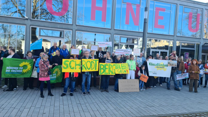 Im Vorfeld der Ratssitzung organisierte das Klimabündnis Solingen eine Protestveranstaltung vor dem Stadttheater gegen die mögliche Ausweisung von 3 neuen Gewerbegebieten im Grüngürtel von Solingen.