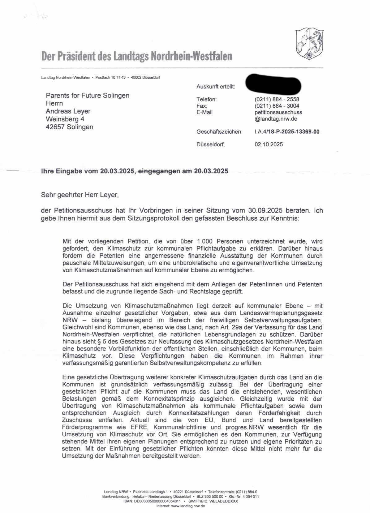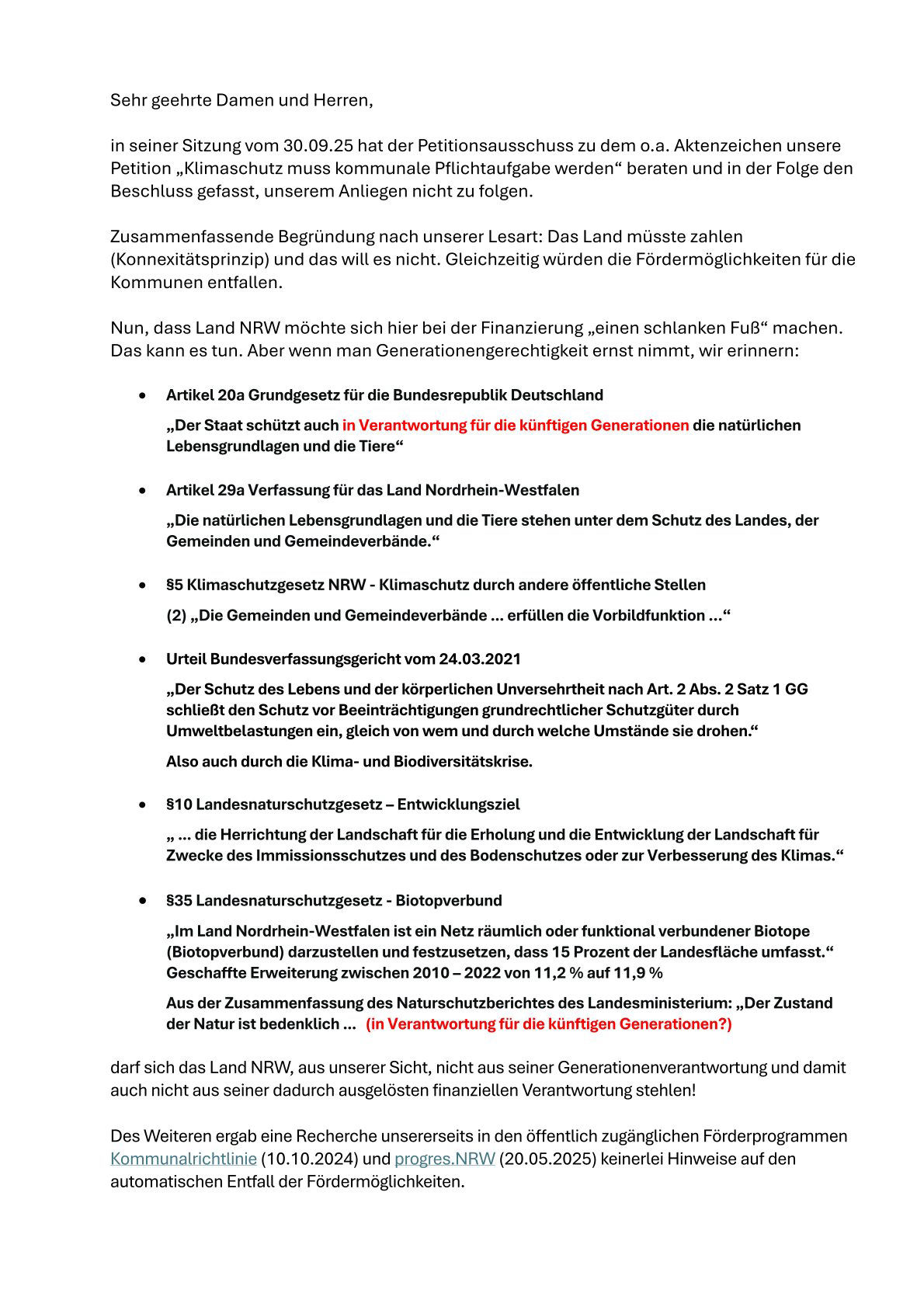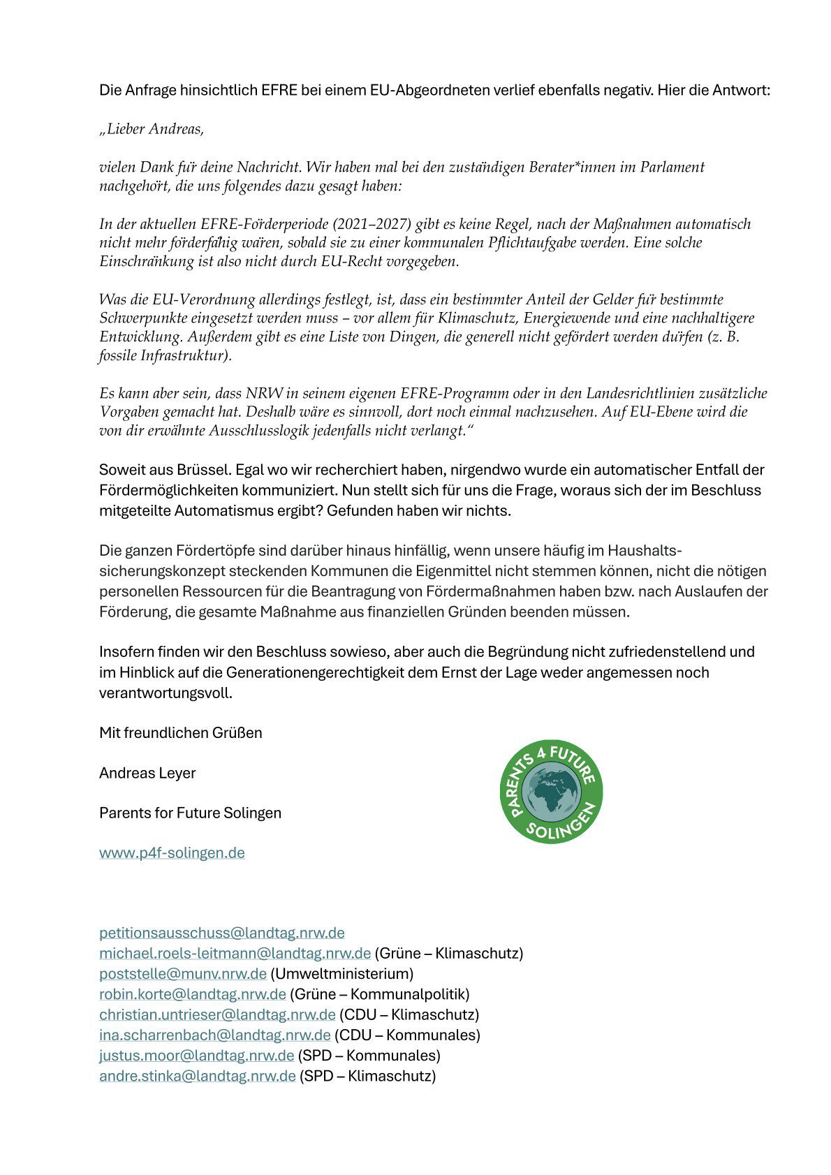 aufgrund Beschluss des Petitionsausschusses unserem Anliegen "Klimaschutz muss kommunale Pflichtaufgabe werden" nicht zu entsprechen, haben wir die im Beschluss genannten Kriterien hinsichtlich automatischem Entfall von Fördermöglichkeiten für die genannten Programme überprüft. Für die öffentlich zugänglichen Programme progres.nrw (20.05.2025) und Kommunalrichtlinie (10.10.2024) haben wir einen solchen Automatismus nicht gefunden. Eine Nachfrage bei der EU in Brüssel bzgl. Förderprogramm EFRE verlief diesbezüglich ebenfalls negativ. Siehe Antwort und Nachfrage P4F-Solingen auf Beschluss.