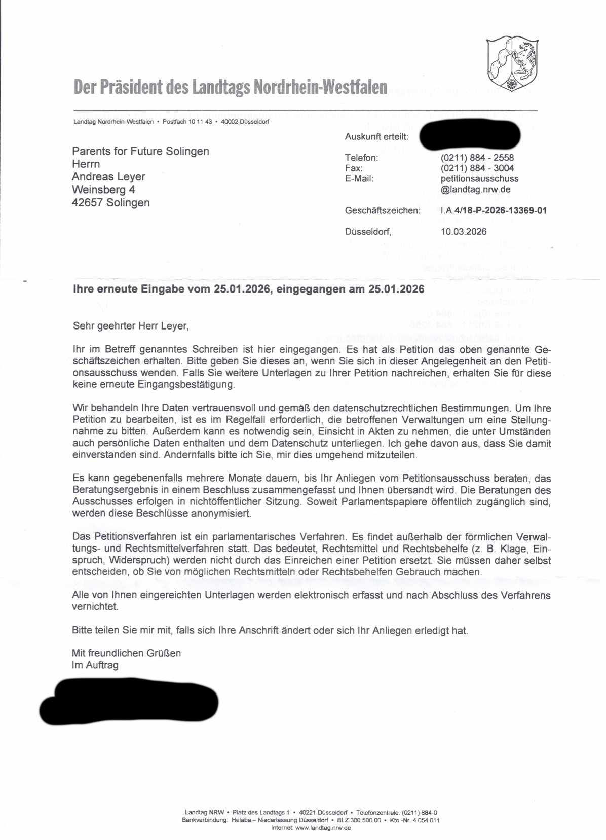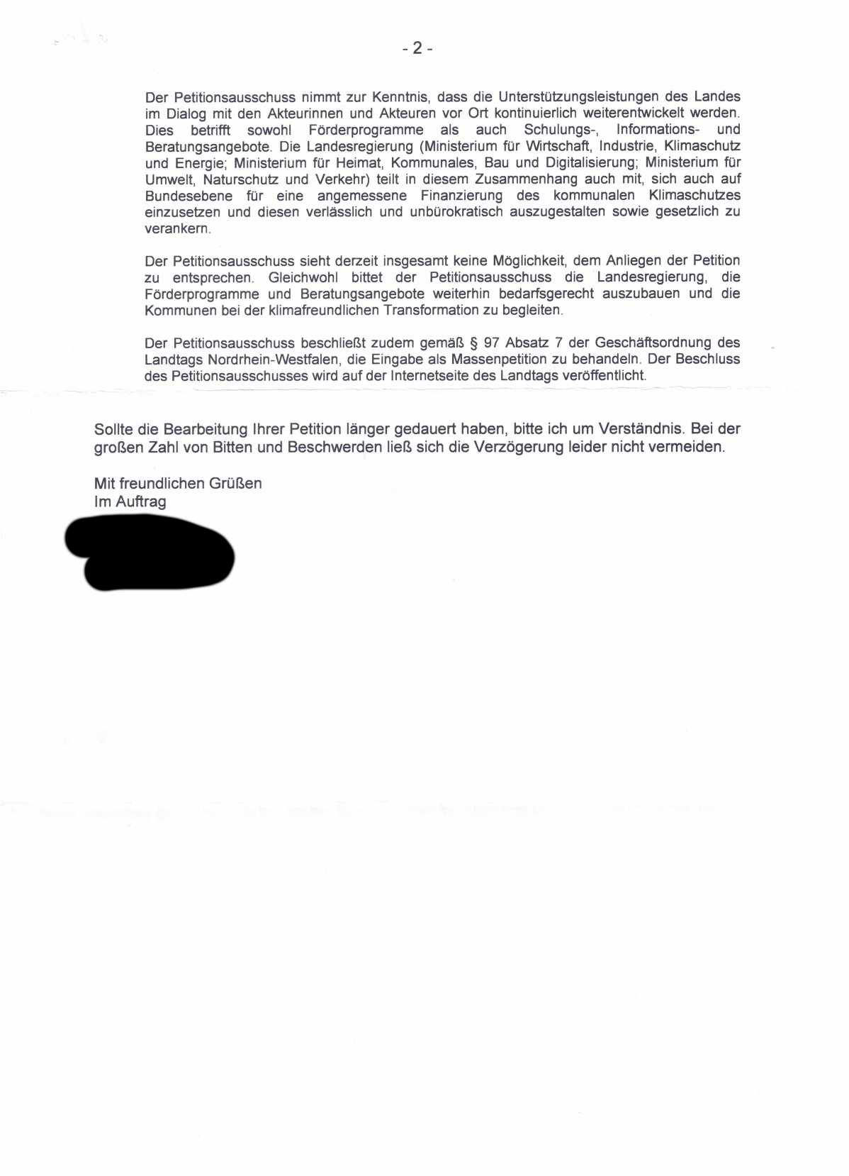 Am 10.03.26 ging hier die "Rückmeldung des Petitionsausschusses" ein. Hieraus folgt, dass unser Nachhaken erneut als Petitionseingabe gewertet wird. Seitens der angeschriebenen Politiker bzw. dem Umweltministerium kam auch weiterhin keine Reaktion.